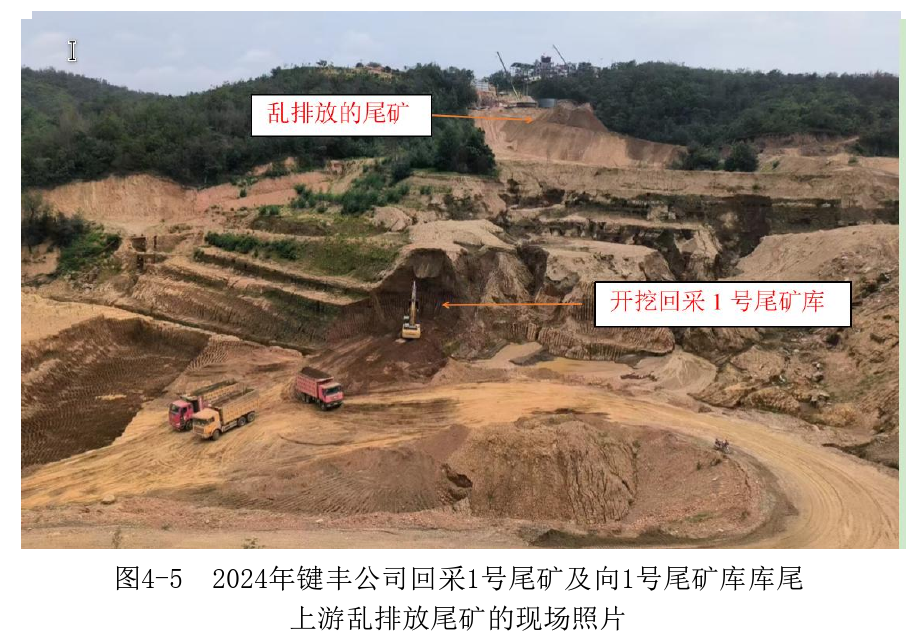 2025年5月5日8时许,键丰公司组织5辆货车先后到尾矿堆场下方倒运前期回采尾矿时挖取的石料。8时38分,1号尾矿库回采开挖形成约57.5米的高陡边坡失稳,上部超高堆积的高含水率流塑态软土坍塌,大量坍塌体随沟谷向下游冲击滑移至约2000米处形成堆积,造成尾矿堆场下脚的5辆货车、1台挖掘机和4名驾驶员及下游沟底约1200米处田地间劳作的1名村民被坍塌体掩埋。1名货车驾驶员发现坍塌及时撤离逃生,挖掘机驾驶员未在现场,幸免于难。